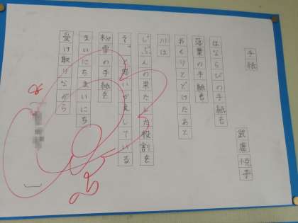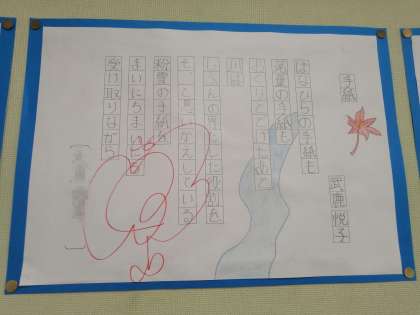 教室の壁面掲示に目をやると、詩の書写が掲示していました。