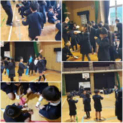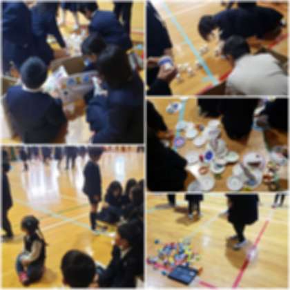 2年生が作ったいろいろなおもちゃで1年生と交流会をしました。回したり、跳ばしたり、投げ上げたり・・・楽しい2時間でした。