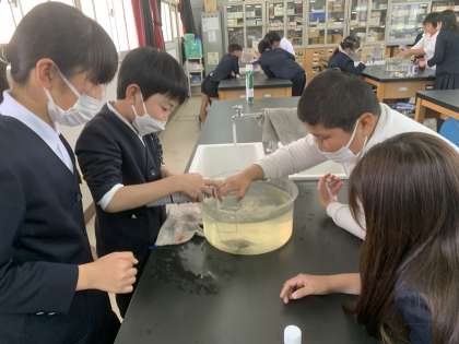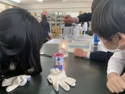 6年生の理科の実験の様子です。酸素、窒素、二酸化炭素のどの気体がものを燃やすはたらきがあるかを調べています。
