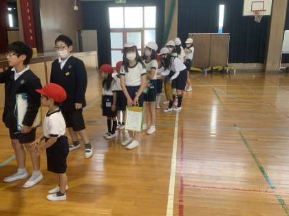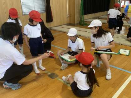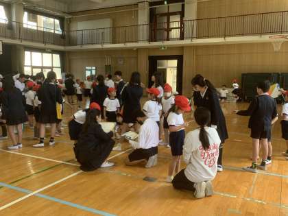 1年生と6年生の交流会を実施しました。反復横跳びや長座体前屈、握力などの体力テストの種目を6年生と1年生のペアで実施しました。6年生が優しく1年生に教えてあげていました。