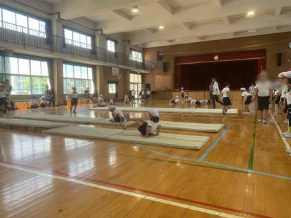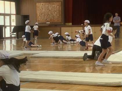 2年生は、1組、2組合同で体育のマット運動に取り組みました。