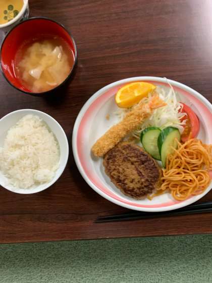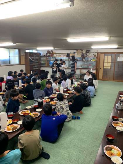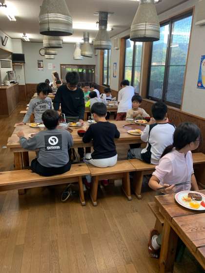 夕食の時間です。芋掘り、魚つかみはできませんでしたが、みんなよく食べています。