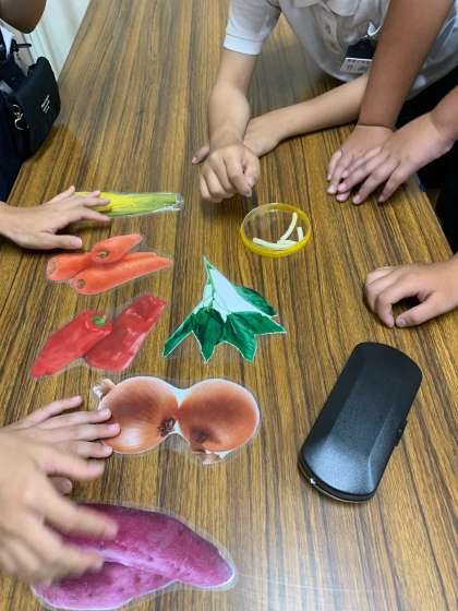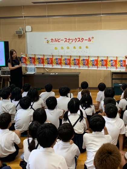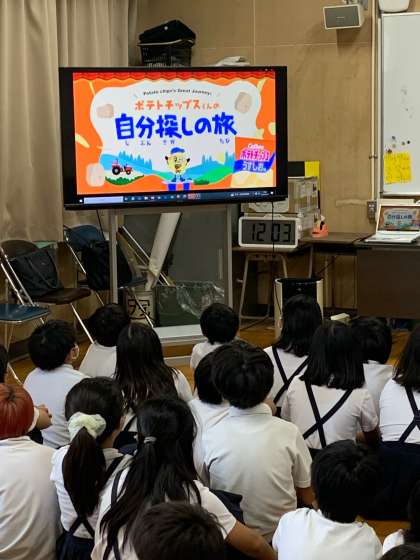 カルビーの方に来ていただき、授業をしてもらいました。お菓子の中にどんな野菜が入っているか考えたり、ポテトチップスができるまでを学んだりしました。