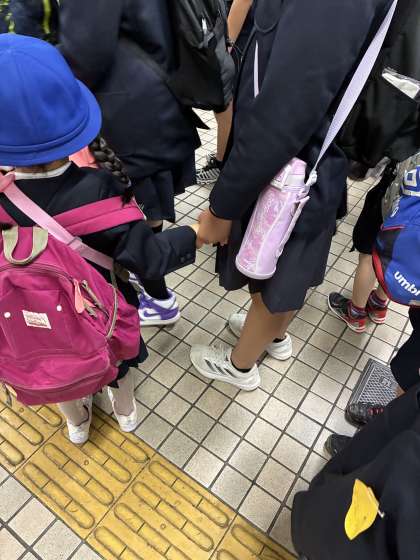 高学年のお兄さん、お姉さんが低学年の手をつないでサポートしてくれています。 高学年のみんな〜頑張れ〜
