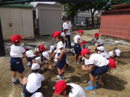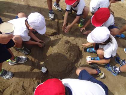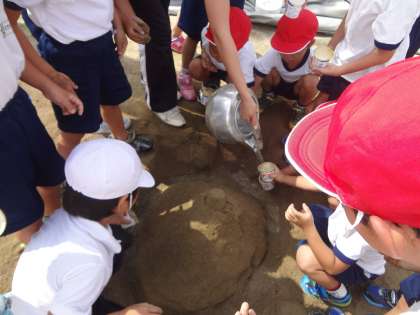 7月15日(金)1年生は、生活科の学習で砂遊びをしました。砂山や砂だんごを作って楽しくすごしました。