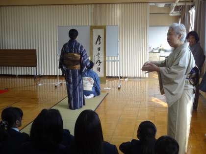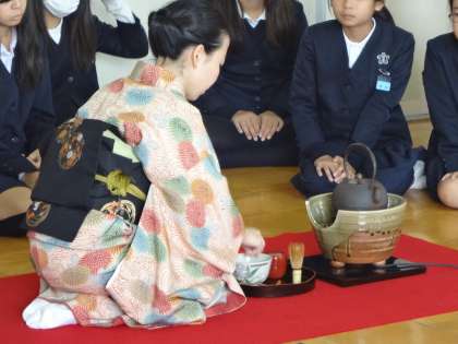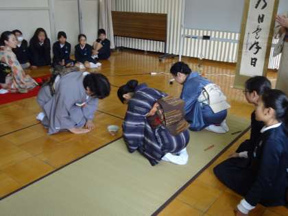 11月22日(火)6年生は、茶道教室を多目的室で行いました。裏千家茶道正教授の内保子先生と山本能楽堂の小嶋由季さん他5名の方々が来校されました。挨拶や礼儀・正座・茶道など、日本の伝統文化を学びました。