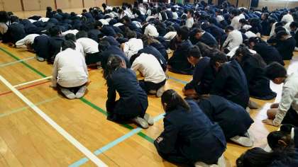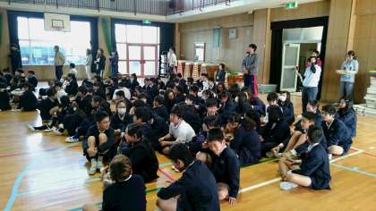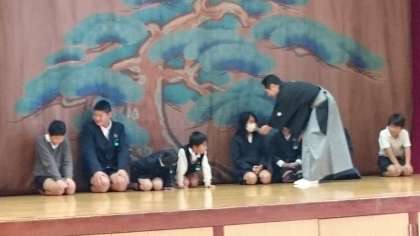 おおらかな笑いの芸術である狂言の表現を全児童が体験しました。
