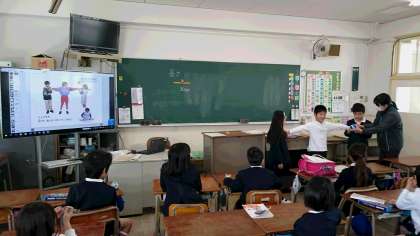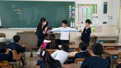 電子黒板や具体物を使って「長さ」の学習をしています。