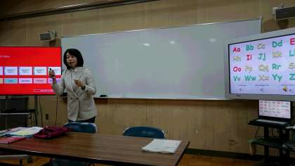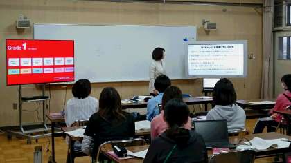 今日は英語活動の進め方について、疑問点や効果的な指導法について確認する研修会を開催しました。