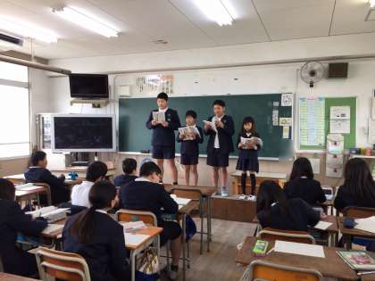 「大造じいさんとがん」の朗読発表会をしました。作品の内容から読みとったことをもとに、自分が感じた感動や思いが伝わるよう工夫し、感情を込めて読みました。それぞれのグループの発表について感想も書き、互いの良さを伝え合いました。