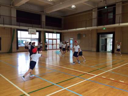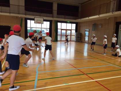今日は雨だったので、講堂で体育をしました。運動会に向けて体つくり運動をした後、ドッジボールをしました。