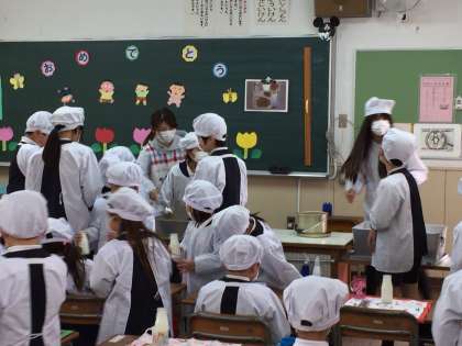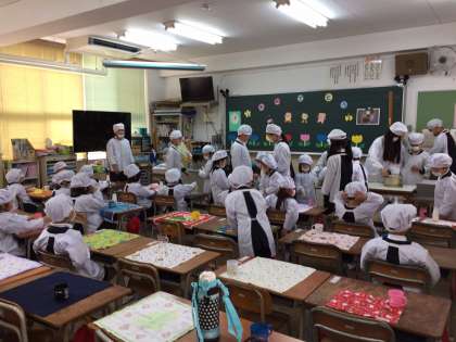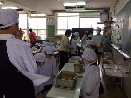 今日も1年生の給食の準備を6年生がお手伝いしました。1年生が徐々に自分達で給食の準備ができるように、牛乳の配り方や食器の置き方などを優しく教えてサポートしました。