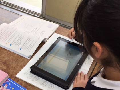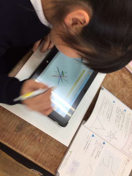 算数で線対称な図形の学習をしました。対応する直線と対称の軸の交わり方を確認したあと、タブレットを活用して問題を解き、学びを深めました。