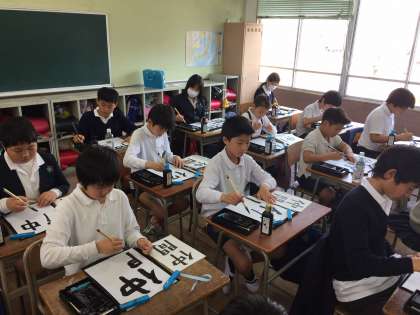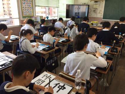 まず、用具の置き方、筆の持ち方を確認しましました。次に、とめ・はらい・おれ・まげなどの筆使いをICT機器を使っておさらいをして書き始め、最後に、書いている時の様子や書きあげた文字をモニターに映し、それぞれの良さを振り返りました。