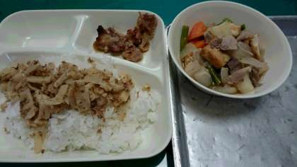 鶏肉のてり焼き/ じゃがいもとあつあげの煮もの/ ごまかかいため