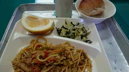 カレースパゲッティ キャベツのひじきドレッシング 河内ばんかん 黒糖パン 牛乳