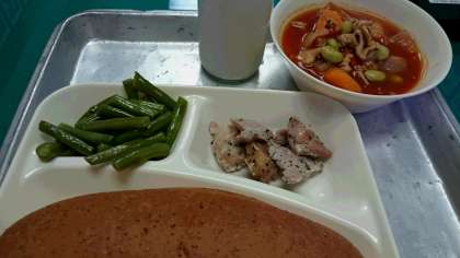 鶏肉のバジル焼き ケチャップ煮 三度豆のソテー ライ麦パン 牛乳