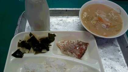赤魚のしょうゆだれかけ みそ汁 わかたけ煮 米飯 牛乳