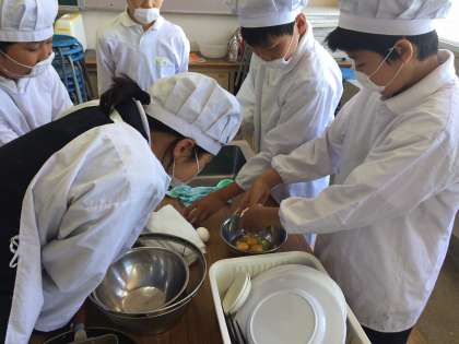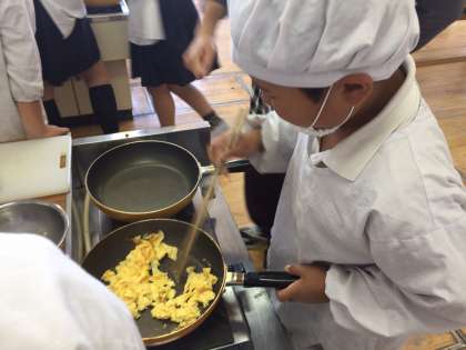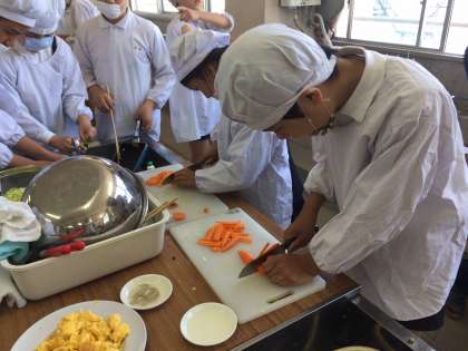 調理実習で野菜炒めをつくりました。授業で炒め方のポイントを学んでいたので、どのグループもとてもおいしく仕上げることができました。