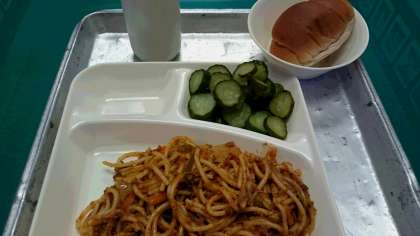 スパゲッティミートソース きゅうりのピクルス 黒糖パン 牛乳