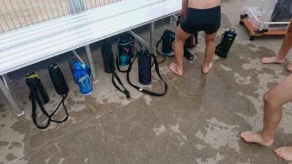 プール開き2日目です。曇りですが蒸し暑く、熱中症予防のため、水分補給をさせています。