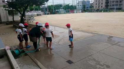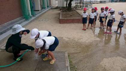 学習後は砂を水道水で洗い流してもらいました。