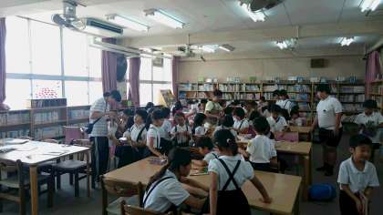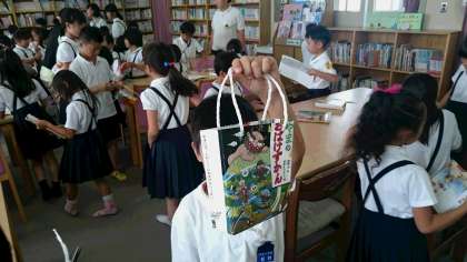 ブックカバーバッグ作りにたくさんの児童が集まりました。