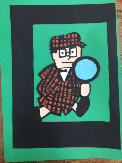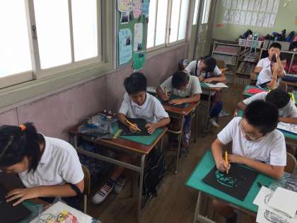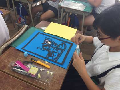 カッターナイフを上手に使い、細かい部分も丁寧に切り抜くことができています。切り抜いた後は、色画用紙で色をつけて仕上げています。