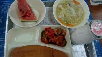 押し麦のスープ 夏野菜とベーコンのソテー すいか レーズンパン 牛乳