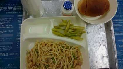 シーフードトマトスパゲッティ グリーンアスパラガスのサラダ はっ酵乳 黒糖パン 牛乳