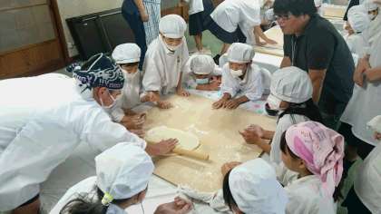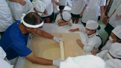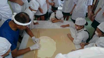 伸ばしたうどんを棒に巻きつけるようにして更に伸ばしていきます。