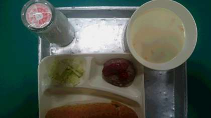焼きハンバーグ 豆乳コーンスープ ボイルキャベツ ライ麦パン 牛乳
