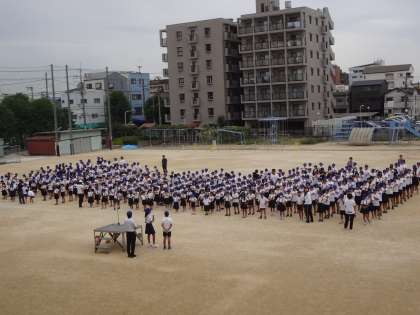 学級ごとに整列し、校長先生と朝のあいさつをして全校朝会がスタートします。