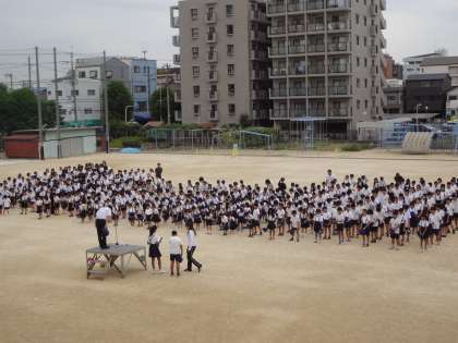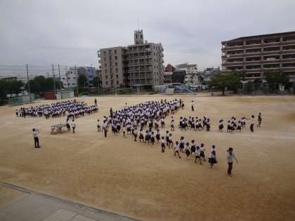 朝会後は、学級ごとにきちんと並んで行進し、教室までもどっています。