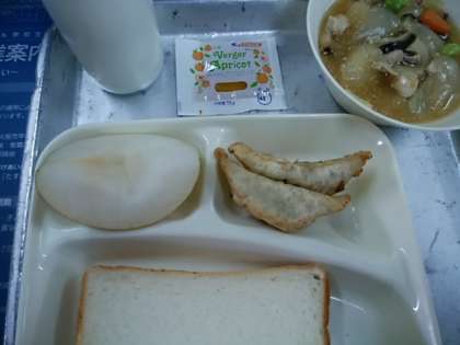 あげギョーザ 鶏肉ととうがんの中華煮 なし(豊水) 食パン アプリコットジャム 牛乳