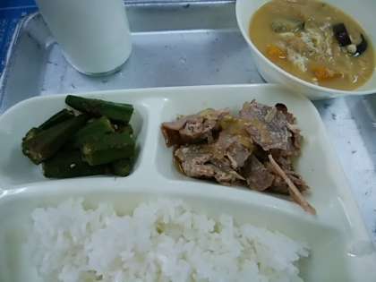 豚肉の甘辛焼き みそ汁 オクラのおかかいため 米飯 牛乳
