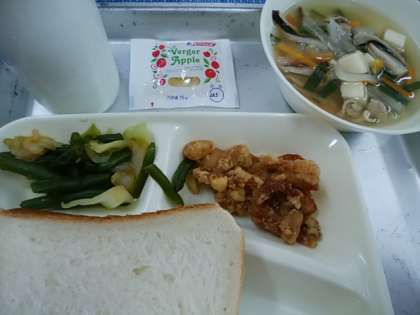 鶏肉のピリからあげ 中華スープ キャベツと三度豆のあえもの 食パン りんごジャム 牛乳