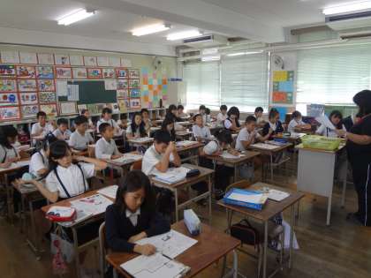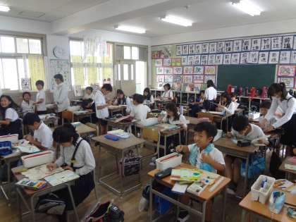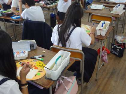 図画工作では、伝言板をつくっています。電動のこぎりで上手に切ったあと、色づけをがんばっています。