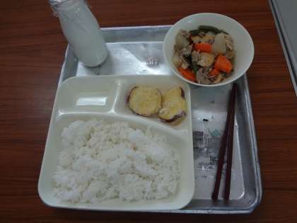 米飯 豚肉と一口がんもの煮もの さつまいものてんぷら ミニフィッシュ 牛乳