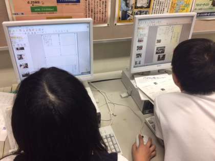 社会見学の新聞作りでは、写真を入れたり、レイアウトを工夫したりして見やすくわかりやすい新聞になるようにがんばっています。記事の内容も社会見学でたくさん書き込んだワークシートを見ながら、読み手が読みたくなる文章になるよう、じっくり考えて仕上げています。