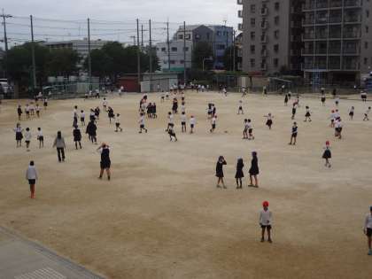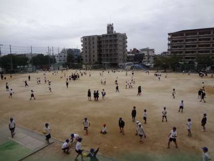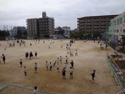 今にも雨が降ってきそうですが、元気に運動場で活動しています。