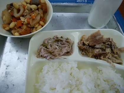 豚肉のごまだれ焼き 大豆の煮もの 切り干しだいこんのしそ甘酢づけ 米飯 牛乳