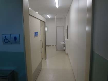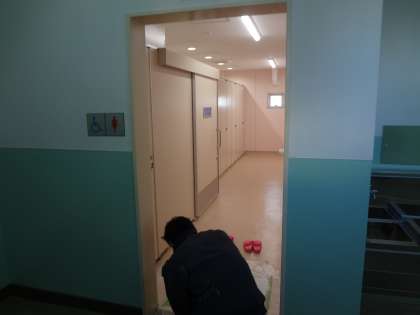 スリッパをきれいに並べるための足形を、管理作業員が床にペイントしています。