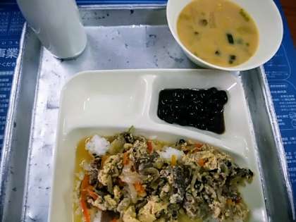他人丼 みそ汁 黒豆の煮もの 米飯 牛乳