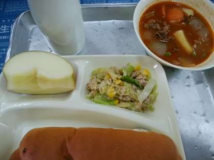 ビーフシチュー ツナとキャベツのソテー りんご レーズンパン 牛乳