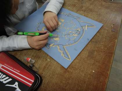 けがをしないように注意しながら、ていねいに彫りすすめています。