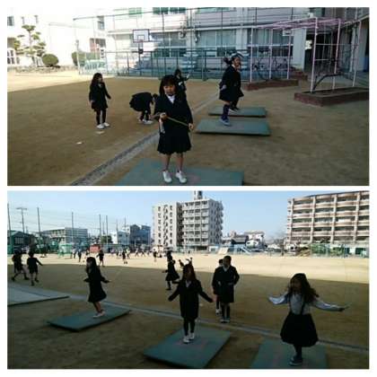 ジャンピングボードを使って縄跳びの練習をしたり、大縄跳びに挑戦したりしています。