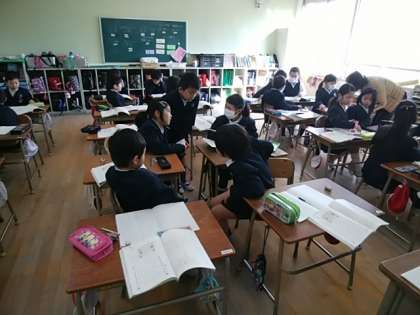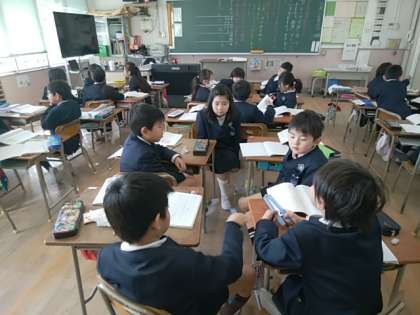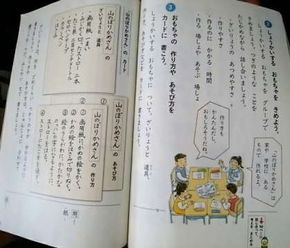 グループで話し合って、「おもちゃ教室」で紹介するおもちゃについて話し合っています。