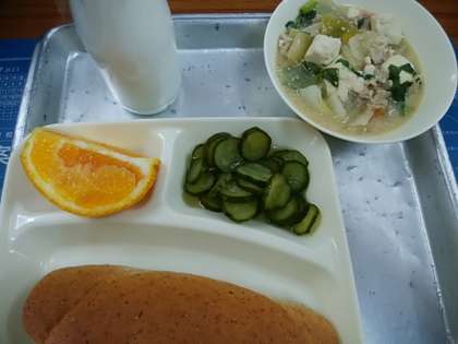 豚肉ととうふのうま煮 きゅうりの中華あえ デコポン ライ麦パン 牛乳