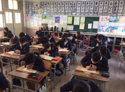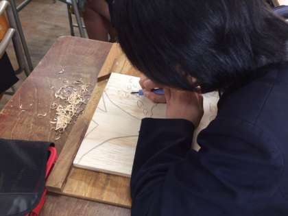 図画工作科で木彫りのアルバムをつくっています。心を込めて丁寧に彫り上げています。